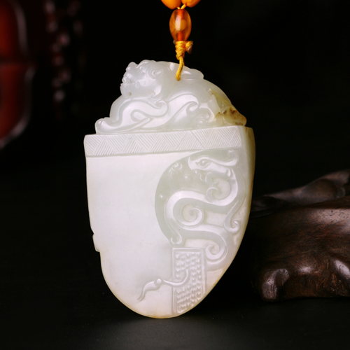 府上興隆題材,亦作“府上有龍”,圖案出自玉雕古圖譜,以古代斧形與斧上盤龍之諧音命名,寓家業(yè)興旺。此款玉牌充滿古樸厚重之風(fēng):色白皙、質(zhì)勻潤(rùn),上雕龍子貔貅,昂首挺胸,盛氣凌然;下琢斧形,斧面上游龍身形充滿張力,似于云中漫步,靈韻興隆之氣畢現(xiàn)。